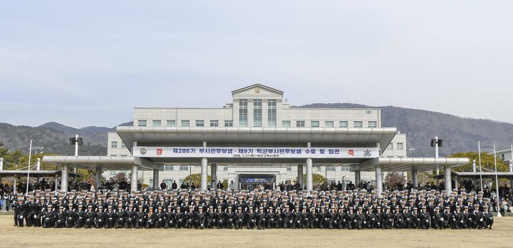 [서울=뉴시스] 27일 경남 창원시 진해구 해군교육사령부에서 열린 제286기 부사관 후보생과 제9기 학군부사관후보생 수료 및 임관식에서 참석자들이 기념촬영 하고 있다. (사진=해군교육사령부 제공) 2025.02.27. [email protected] *재판매 및 DB 금지