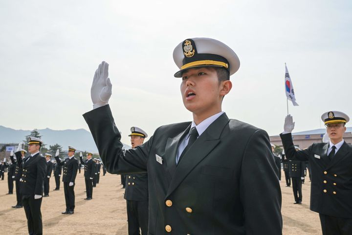 [서울=뉴시스] 27일 경남 창원시 진해구 해군교육사령부에서 열린 제286기 부사관 후보생과 제9기 학군부사관후보생 수료 및 임관식에서 임관하는 하사들이 선서하고 있다. (사진=해군교육사령부 제공) 2025.02.27. [email protected] *재판매 및 DB 금지