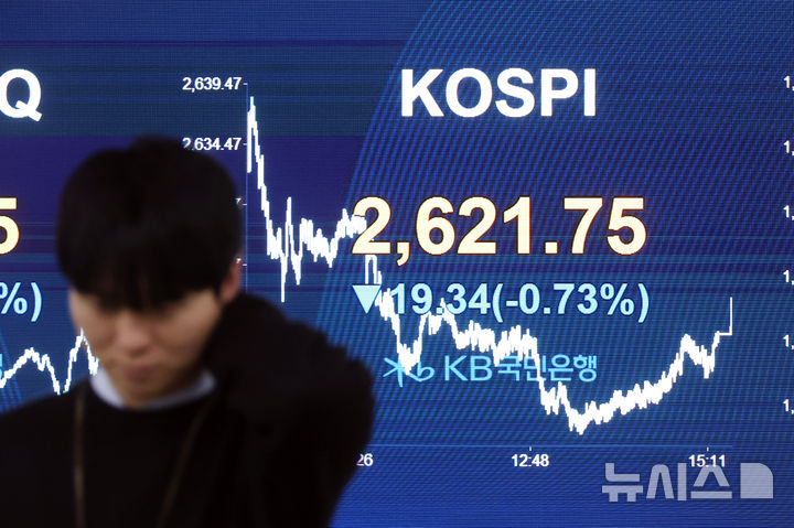 [서울=뉴시스] 고승민 기자 = 코스피가 전 거래일(2641.09)보다 19.34포인트(0.73%) 하락한 2621.75에 장을 마친 27일 서울 여의도 KB국민은행 딜링룸에서 관계자가 업무를 보고 있다.