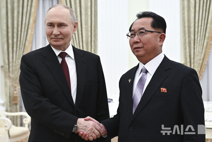 [모스크바=AP/뉴시스] 블라디미르 푸틴(왼쪽) 러시아 대통령과 리히용 북한 노동당 중앙위원회 정치국 위원 겸 당 중앙위원회 비서가 27일(현지 시간) 러시아 모스크바 크렘린궁에서 만나 악수하고 있다. 두 사람의 회담 내용은 알려지지 않았으며 리히용 비서는 조선노동당 대표단을 이끌고 지난 24일부터 러시아를 방문 중이다. 2025.02.28.