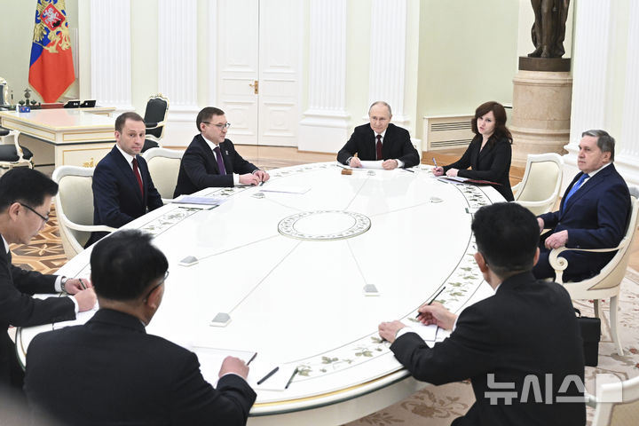 [모스크바=AP/뉴시스] 블라디미르 푸틴(가운데) 러시아 대통령과 리히용 북한 노동당 중앙위원회 정치국 위원 겸 당 중앙위원회 비서가 27일(현지 시간) 러시아 모스크바 크렘린궁에서 만나 회담하고 있다. 두 사람의 회담 내용은 알려지지 않았으며 리히용 비서는 조선노동당 대표단을 이끌고 지난 24일부터 러시아를 방문 중이다. 2025.02.28.