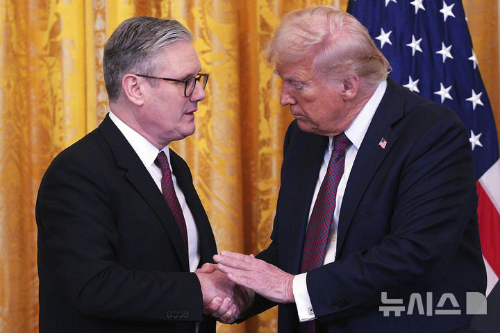 [워싱턴=AP/뉴시스] 도널드 트럼프(오른쪽) 미국 대통령과 키어 스타머 영국 총리가 27일(현지 시간) 백악관 이스트룸에서 공동 기자회견 중 악수하고 있다. 트럼프 대통령은 "러-우크라이나 전쟁을 끝내기 위한 협상 창구는 지극히 비좁은 하나뿐"이라고 강조했다. 2025.02.28.
