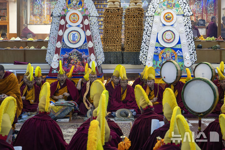[다람살라=AP/뉴시스] 28일(현지 시간) 인도 다람살라 추글라캉 사원에서 망명 티베트 불교 승려들이 티베트 새해 '로사르'를 맞아 기도 의식을 행하고 있다. 2025.02.28.