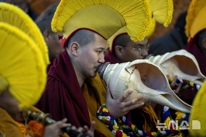 [다람살라=AP/뉴시스] 28일(현지 시간) 인도 다람살라 추글라캉 사원에서 망명 티베트 불교 승려들이 티베트 새해 '로사르'를 맞아 기도 의식을 행하면서 소라껍데기 나팔을 불고 있다. 2025.02.28.
