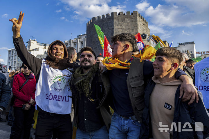 [디야르바키르(튀르키예)=AP/뉴시스]튀르키예 디야르바키르에서 27일(현지시각) 사람들이 수감된 쿠르드 반군 쿠르드노동자당(PKK) 지도자 압둘라 외잘란의 성명을 친쿠르드족 인민민주당(DEM) 대표단이 낭독하는 TV 생중계 화면을 지켜보며 환호하고 있다. 외잘란은 이날 PKK에 무기를 내려놓고 자진 해체할 것을 촉구했다. 2025.02.28.