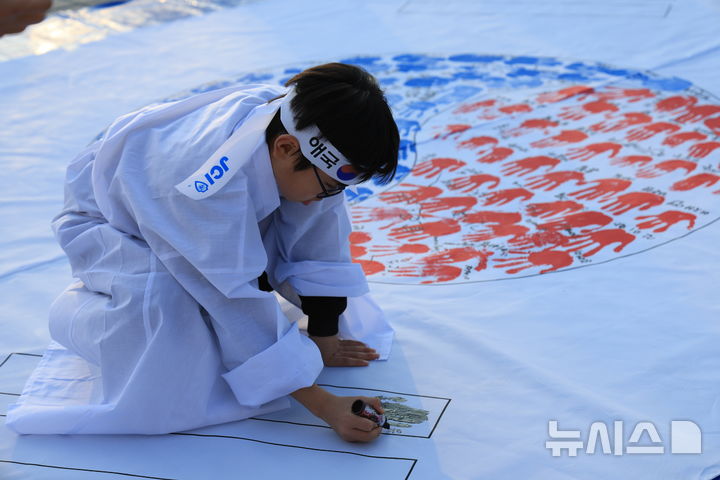 [천안=뉴시스] 박우경 기자 = 28일 3.1운동 제106주년 기념 아우내봉화제가 충남 천안시 유관순사적지 일원에서 열린 가운데 한 어린이가 태극기 만들기 행사에 참여하고 있다. 2025.2.28 [email protected]