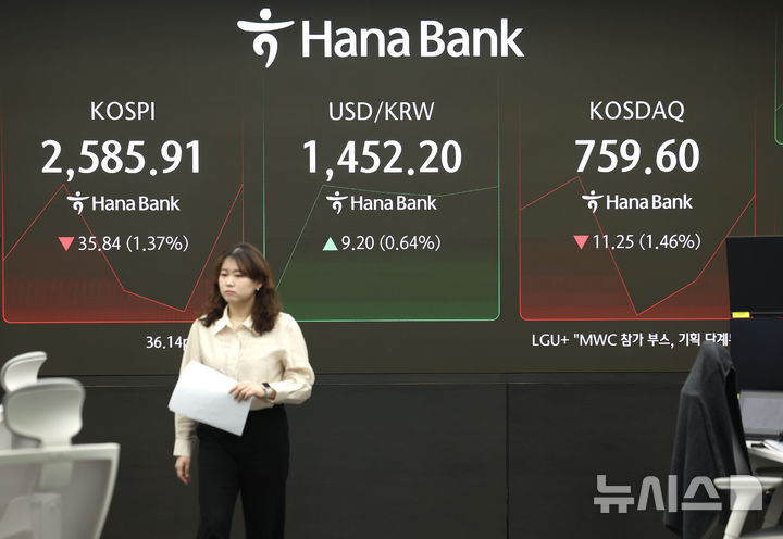 [서울=뉴시스] 김명년 기자 = 코스피가 전 거래일(2621.75)보다 36.14포인트(1.38%) 내린 2585.61에 개장한 28일 오전 서울 중구 하나은행 딜링룸에서 딜러들이 업무를 보고 있다. 코스닥 지수는 전 거래일(770.85)보다 10.75포인트(1.39%) 하락한 760.10에 거래를 시작했다. 원·달러 환율은 전 거래일 주간거래 종가(1443.0원)보다 8.0원 오른 1451.0원에 출발했다. 2025.02.28. [email protected]