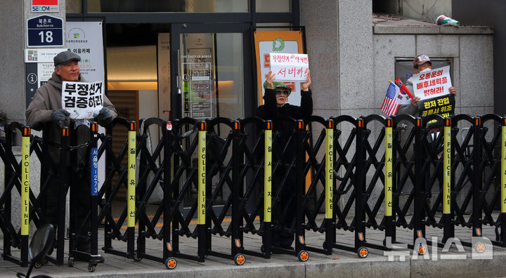 [서울=뉴시스] 김혜진 기자 = 헌법재판소가 헌법재판소가 마은혁 헌법재판관 후보자를 임명하라는 결론을 내렸다. 마 후보자가 임명되면 헌재가 그를 윤석열 대통령 탄핵심판에 참여시킬지 여부가 관심이다. 사진은 28일 서울 종로구 헌법재판소 앞에서 윤석열 대통령 지지자가 피켓을 들고 있다. 2025.02.28. [email protected]