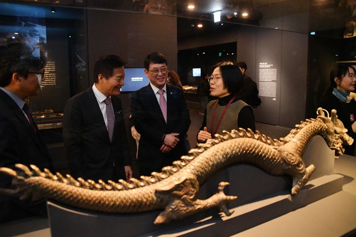 [서울=뉴시스] 최응천(가운데) 국가유산청장이 28일 서울 종로구 국립고궁박물관에서 박주형(왼쪽 두 번째) 신세계 대표이사 등 관계자들과 함께 국립고궁박물관 소장 유물인 ‘경회루 연못출토 청동용’을 살펴보고 있다. (사진=국가유산청 제공) 2025.02.28. [email protected] *재판매 및 DB 금지