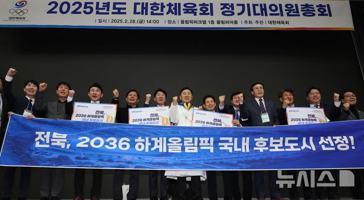 [서울=뉴시스] 김금보 기자 = 김관영 전라북도 도지사를 비롯한 전북 관계자가 28일 서울 송파구 올림픽파크텔에서 열린 2025년도 대한체육회 정기대의원총회에서 전북이 2036년 하계올림픽대회 유치 후보 도시에 선정된 후 기념촬영을 하고 있다. 2025.02.28. [email protected]