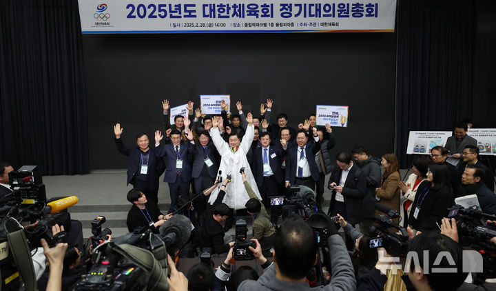 [서울=뉴시스] 김금보 기자 = 김관영 전라북도 도지사를 비롯한 전북 관계자가 28일 서울 송파구 올림픽파크텔에서 열린 2025년도 대한체육회 정기대의원총회에서 전북이 2036년 하계올림픽대회 유치 후보 도시에 선정된 후 기뻐하고 있다. 2025.02.28. [email protected]