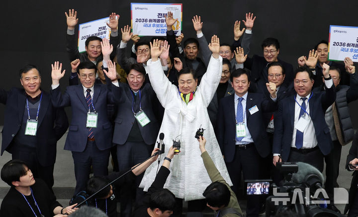 [서울=뉴시스] 김금보 기자 = 김관영 전라북도 도지사와 관계자들이 28일 서울 송파구 올림픽파크텔에서 열린 2025년도 대한체육회 정기대의원총회에서 전북 전주가 2036년 하계올림픽대회 유치 신청 도시에 선정된 후 기념촬영을 하고 있다. 2025.02.28. [email protected]