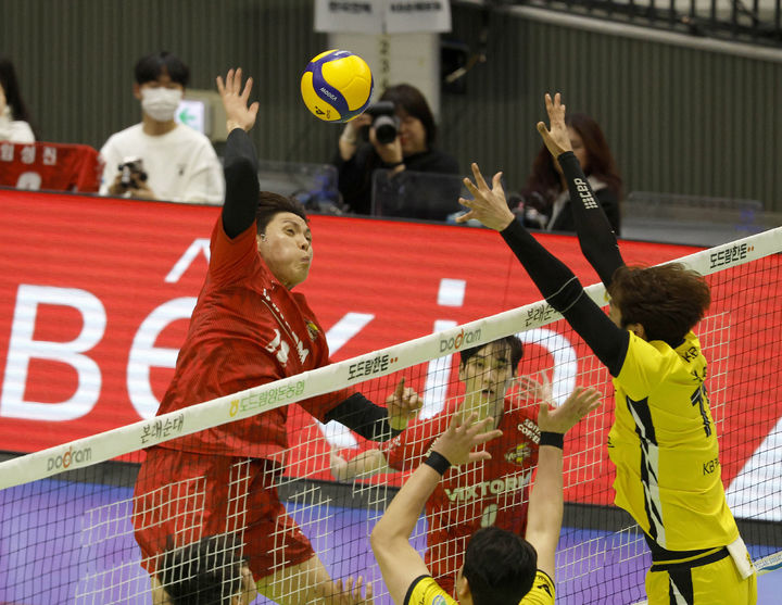 [서울=뉴시스] 추상철 기자 = 28일 경기 수원시 수원실내체육관에서 열린 도드림 24-25 V리그 한국전력과 KB와의 경기, 한국전력 전진선이 강 스파이크를 때리고 있다. (사진= 한국전력 배구단 제공) 2025.02.28. [email protected] *재판매 및 DB 금지