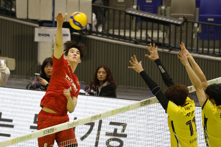 [서울=뉴시스] 추상철 기자 = 28일 경기 수원시 수원실내체육관에서 열린 도드림 24-25 V리그 한국전력과 KB와의 경기, 한국전력 임성진이 강 스파이크를 때리고 있다. (사진= 한국전력 배구단 제공) 2025.02.28. [email protected] *재판매 및 DB 금지
