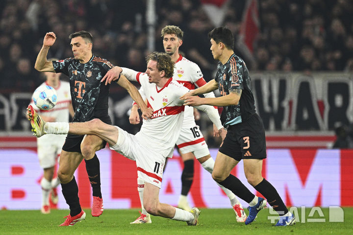 [슈투트가르트=AP/뉴시스] 바이에른 뮌헨의 김민재(오른쪽)가 지난달 28일(현지 시간) 독일 슈투트가르트 메르세데스 벤츠 아레나에서 열린 2024-25 분데스리가 24라운드 슈투트가르트와의 경기 중 공을 다투고 있다. 김민재는 풀타임을 소화하며 팀의 3-1 승리에 기여했다. 2025.03.01.