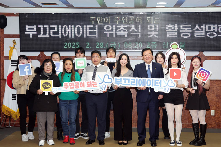 [광주=뉴시스] 박기웅 기자 = 문인 광주 북구청장과 온라인소통팀 직원들이 지난 28일 북구청 소회의실에서 열린 '제1기 부끄리에이터 위촉식'에서 부끄리에이터로 활동할 배우와 댄스팀 등 참가자들과 기념촬영을 하고 있다. 이들은 일상 속 북구 정책을 창의적으로 재구성한 구정 홍보 영상 제작 활동에 나설 예정이다. (사진 = 광주 북구 제공) 2024.03.01. [email protected]