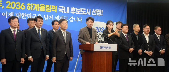 [전주=뉴시스] 김얼 기자 = 우범기(가운데) 전주시장이 1일 전북 전주시 전북특별자치도 기자회견장에서 열린 '전북 전주, 2036 하계올림픽 국내 후보도시 선정!' 기자회견에 참석해 질의에 답변하고 있다. 2025.03.01. [email protected]