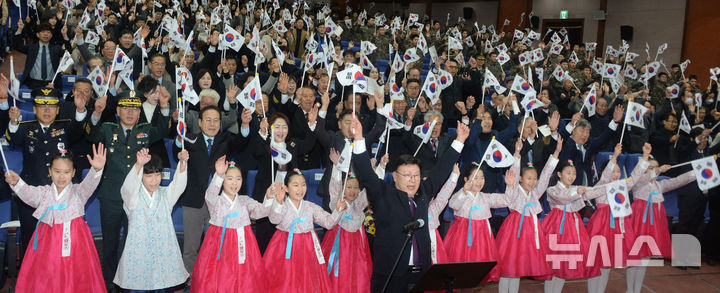 [전주=뉴시스] 김얼 기자 = 문승우 전북특별자치도의장을 비롯한 관계자들이 1일 전북 전주시 전북특별자치도청 공연장에서 열린 '106주년 3·1절기념식'에 만세삼창을 외치고 있다. 2025.03.01. [email protected]