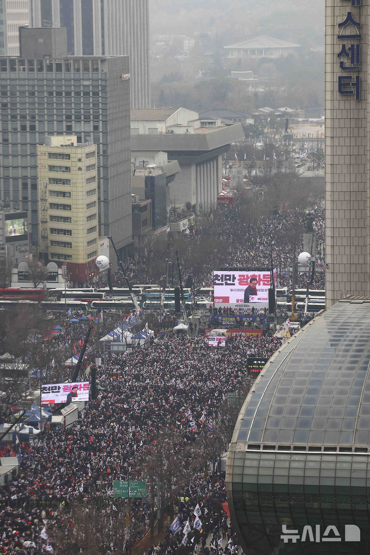 [서울=뉴시스] 김근수 기자 = 대한민국바로세우기운동본부 등 보수단체 회원들이 1일 서울 종로구 세종대로 일대에서 불법, 사기탄핵반대 3.1절 광화문국민대회를 하고 있다. 2025.03.01. [email protected]