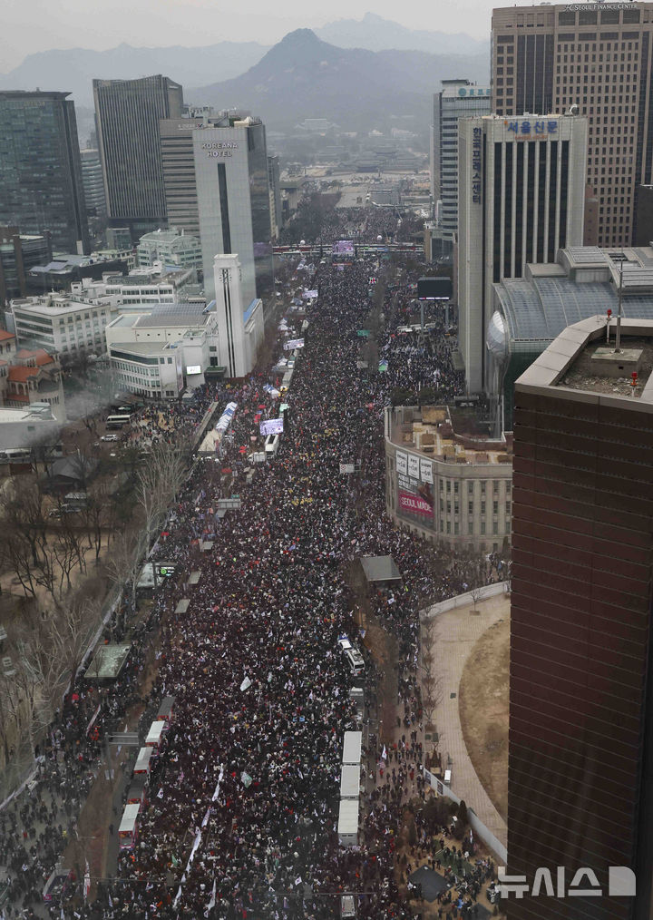 [서울=뉴시스] 김근수 기자 = 대한민국바로세우기운동본부 등 보수단체 회원들이 1일 서울 종로구 세종대로 일대에서 불법, 사기탄핵반대 3.1절 광화문국민대회를 하고 있다. 2025.03.01. [email protected]