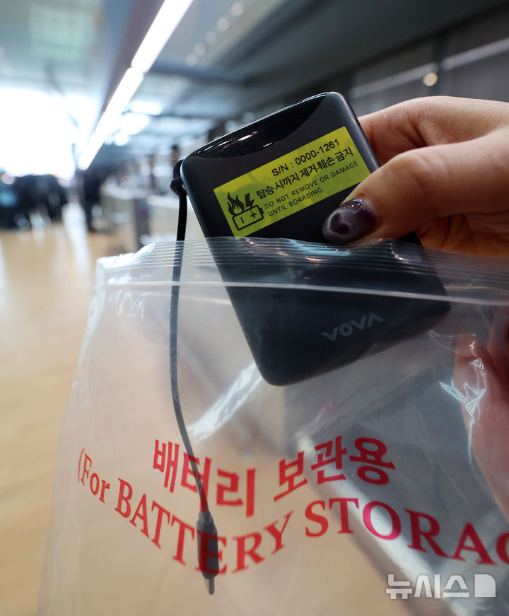 [서울=뉴시스] 김명년 기자 = 1일 인천국제공항 제2여객터미널 대한항공 체크인 카운터에서 관계자가 보조배터리에 스티커를 부착한 뒤 비닐봉지에 넣고 있다. 국토교통부는 이날부터 보조배터리와 전자담배 안전관리 체계 강화 표준안을 시행한다 2025.03.01. [email protected]