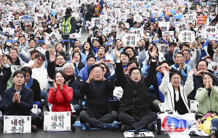 [서울=뉴시스] 김근수 기자 = 이재명 더불어민주당 대표 등 야5당 대표들이 1일 서울 종로구 안국역 인근에서 열린 3.1절 야5당 공동 내란종식 및 민주헌정수호를 위한 윤석열 파면 촉구 범국민대회에 참석해 있다. 2025.03.01. [email protected]