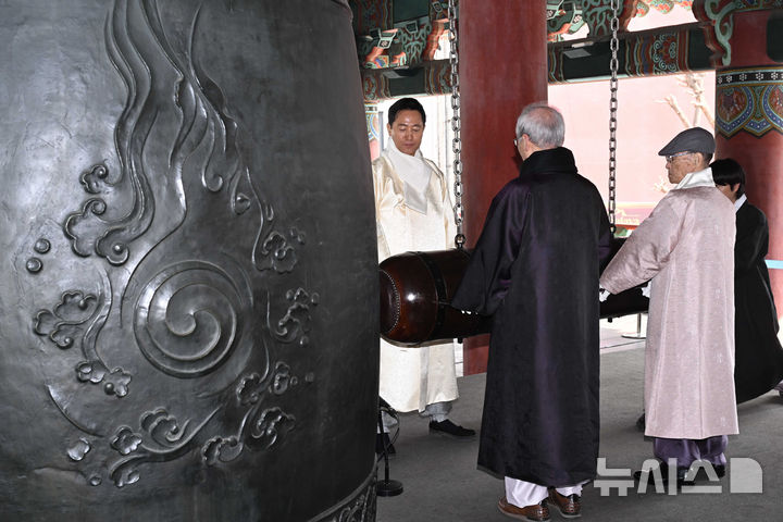 [서울=뉴시스] 사진공동취재단 = 오세훈 서울시장과 독립유공자 후손을 비롯한 참석자들이 1일 서울 종로구 보신각에서 열린 제106주년 3·1절 기념 타종행사에서 타종을 하고 있다. 2025.03.01. [email protected]