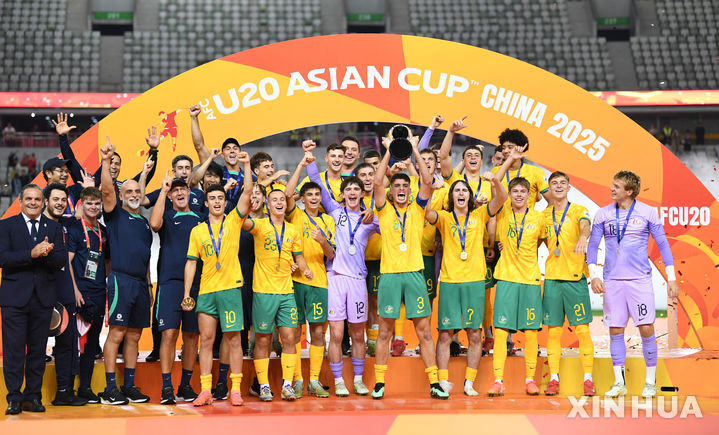 [선전=신화/뉴시스] 호주 선수들이 1일(현지 시간) 중국 광둥성 선전 바오안 스포츠센터 스타디움에 열린 2025 아시아축구연맹(AFC) 20세 이하(U-20) 아시안컵 정상에 올라 환호하고 있다. 호주는 결승전에서 사우디아라비아와 1-1 무승부를 기록해 승부차기 끝에 5-4로 승리하고 우승컵을 들어 올렸다. 2025.03.02.