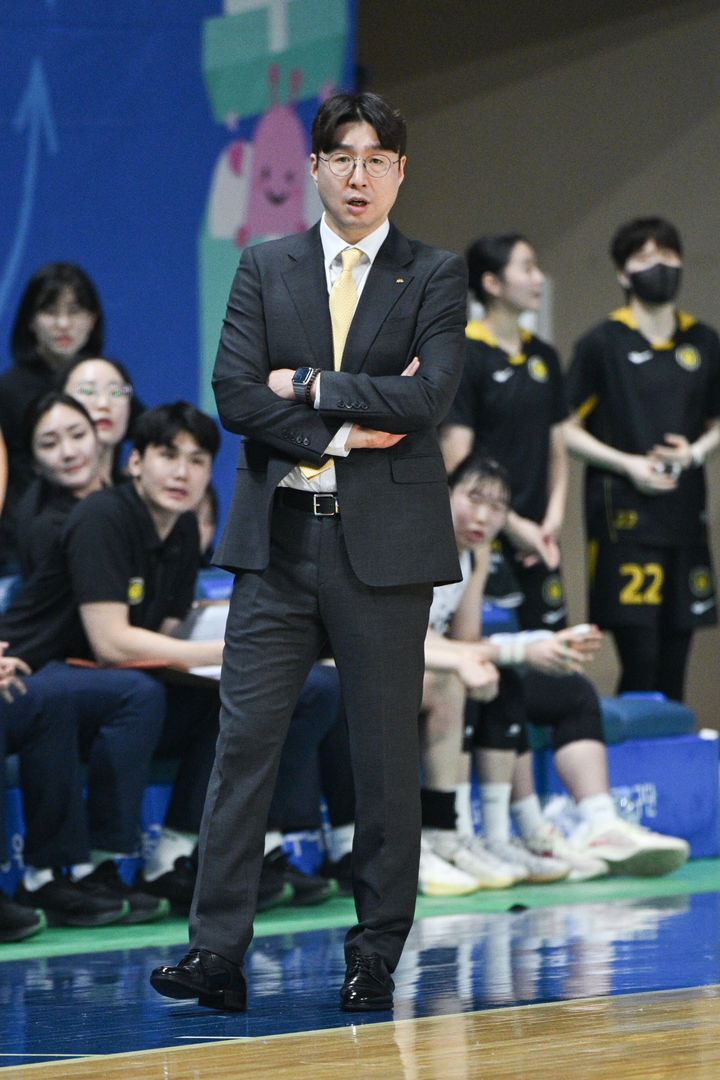 [서울=뉴시스] 황준선 기자 = 2일 충남 아산시 이순신체육관에서 열린 2024-2025 여자프로농구 플레이오프 1차전 아산 우리은행 우리 WON과 청주 KB스타즈의 경기, KB스타즈 김완수 감독이 경기를 지켜보고 있다. (사진=한국여자농구연맹 제공) 2025.03.02. [email protected] *재판매 및 DB 금지