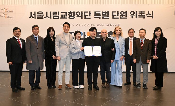 [서울=뉴시스] 황준선 기자 = 오세훈 서울시장이 2일 서울 서초구 예술의전당 콘서트홀에서 열린 서울시립교향악단 아주 특별한 콘서트 및 특별단원 위촉식에 참석해 특별단원이 된 김민철 클라리네티스트를 비롯한 참석자들과 기념촬영을 하고 있다. (사진=서울시 제공) 2025.03.02. [email protected] *재판매 및 DB 금지