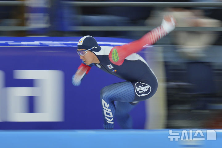[헤이렌베인=AP/뉴시스] 김준호가 2일(현지 시간) 네덜란드 헤이렌베인 티알프 아이스 아레나에서 열린 2024-25 국제빙상경기연맹(ISU) 스피드스케이팅 월드컵 6차 남자 500m 경기를 펼치고 있다. 김준호는 34초55의 기록으로 4위를 차지하며 메달은 따내지 못했다. 2025.03.03.