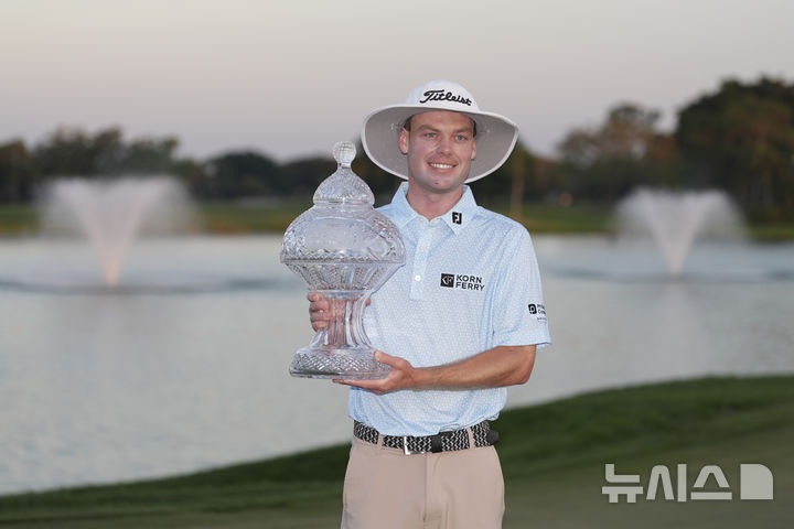 [팜비치가든스=AP/뉴시스] 조 하이스미스(미국)가 2일(현지 시간) 미 플로리다주 팜비치가든스 PGA 내셔널 리조트 챔피언스 코스에서 열린 미국프로골프(PGA) 투어 코그니전트 클래식 정상에 올라 트로피를 들고 포즈를 취하고 있다. 하이스미스는 최종 합계 19언더파 265타로 투어 첫 우승의 기쁨을 누렸다. 2025.03.03.