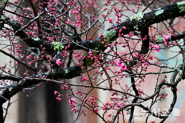 [양산=뉴시스] 차용현 기자 = 봄비가 내리고 있는 3일 오전 경남 양산시 통도사 경내에 홍매화가 꽃망울을 터트려 눈길을 끌고 있다. 2025.03.03. [email protected]