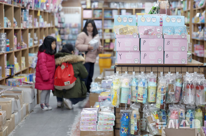 [서울=뉴시스] 김진아 기자 = 새학기를 앞둔 3일 서울 종로구 창신동 문구완구거리에서 학부모와 학생들이 학용품을 고르고 있다. 2025.03.03. [email protected]