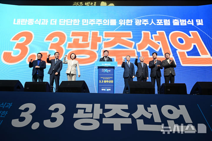 [광주=뉴시스] 박기웅 기자 = 3일 오후 3시 광주 서구 김대중컨벤션센터에서 열린 '광주人(인)포럼 출범식'에서 광주·전남 국회의원들이 인사말을 하고 있다. 왼쪽부터 더불어민주당 박지원, 신정훈, 전진숙, 정준호, 민형배, 양부남, 박균택, 조인철 의원. 2025.03.03. [email protected]