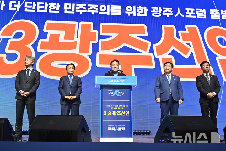 [광주=뉴시스] 박기웅 기자 = 3일 오후 3시 광주 서구 김대중컨벤션센터에서 열린 '광주人(인)포럼 출범식'에서 포럼 지도위원인 광주지역 자치단체장들이 인사말을 하고 있다. 왼쪽부터 김이상 서구청장, 강기정 광주시장, 임택 동구청장, 김병내 남구청장, 박병규 광산구청장. 2025.03.03. [email protected]