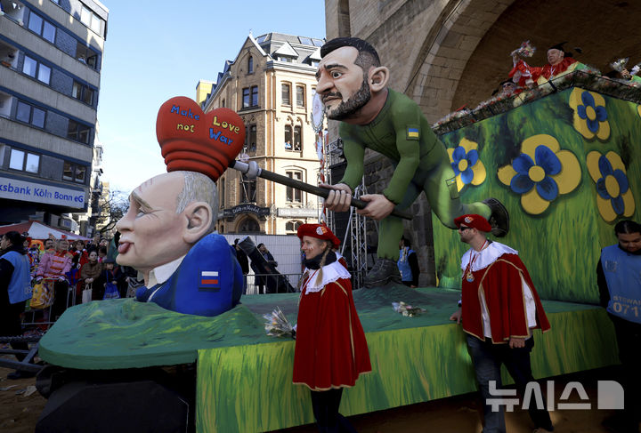 [쾰른=AP/뉴시스] 3일(현지 시간) 독일 쾰른에서 열린 전통 로즈 먼데이 카니발 퍼레이드에서 볼로디미르 젤렌스키 우크라이나 대통령이 블라디미르 푸틴 러시아 대통령을 사랑의 망치로 내려치는 모습의 조형물이 행진하고 있다. 2025.03.04.