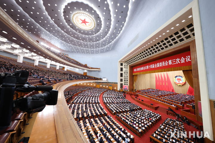 [베이징=신화/뉴시스] 4일(현지 시간) 중국 베이징 인민대회당에서 제14기 전국인민정치협상회의(정협) 제3차 회의가 열리고 있다. 5일에는 전국인민대표대회(전인대)가 개막한다. 2025.03.04.