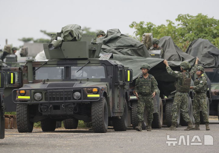 [핑둥(대만)=AP/뉴시스]대만 군인들이 2024년 8월26일 대만 남부 핑둥(屛東)현에서 군사훈련 중 대전차 미사일 운반 차량 M1167 HMMWV(고기동성 다목적 바퀴 달린 차량)를 보호하고 있다. 구리슝(顧立雄) 대만 국방부장은 4일 "급격히 변화하는 국제 정세와 적대국들의 위협이 고조되고 있는 상황으로 대만이 군사비를 늘릴 것"이라고 말했다. 2025.03.04.