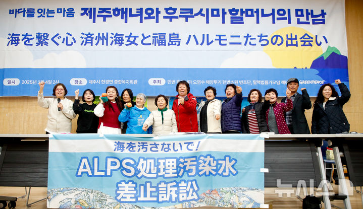 [제주=뉴시스] 우장호 기자 = 4일 오후 제주시 한경면종합복지회관 1층 대강당에서 민변 후쿠시마 오염수 해양투기 헌법소원 변호단과 탈법률가모임 해바라기, 그린피스 주최로 열린 '제주해녀와 후쿠시마 할머니들의 만남' 행사에서 참석자들이 기념촬영하고 있다. 2025.03.04. [email protected]