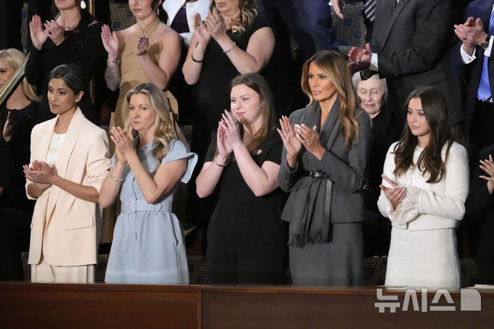 [워싱턴=AP/뉴시스] 멜라니아 트럼프(오른쪽 두 번째) 여사가 4일(현지 시간) 미 의회에서 도널드 트럼프 미국 대통령의 상·하원 합동 연설 중 기립 박수하고 있다. 2025.03.05.