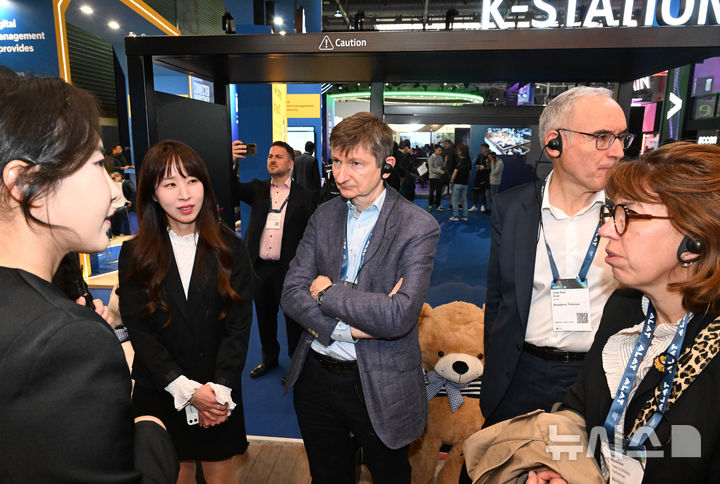 [바르셀로나=뉴시스] 사진공동취재단 = 프랑스 통신사 부이그텔레콤(Bouygues Telecom) 브누아 톨로팅 대표가 4일(현지시간) 스페인 바르셀로나 피라 그란 비아 전시장에서 열린 '모바일 월드 콩그레스(MWC) 2025' KT 부스를 둘러보고 있다. 2025.03.05. [email protected]