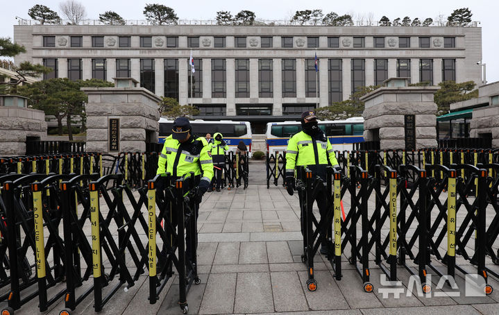 [서울=뉴시스] 이영환 기자 = 5일 오전 서울 종로구 헌법재판소 앞에서 경찰이 근무를 하고 있다.