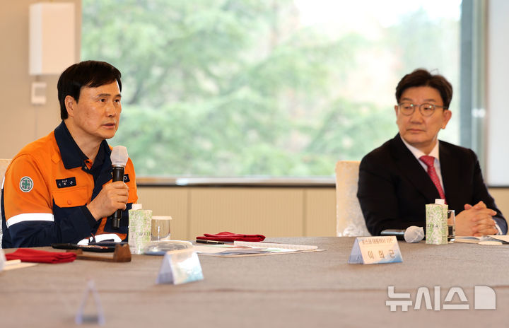 [포항=뉴시스] 이무열 기자 = 이희근 포스코 사장이 5일 경북 포항시 포스코 청송대에서 열린 철강 산업 위기 극복을 위한 현장 간담회에서 인사말을 하고 있다. 2025.03.05. [email protected]