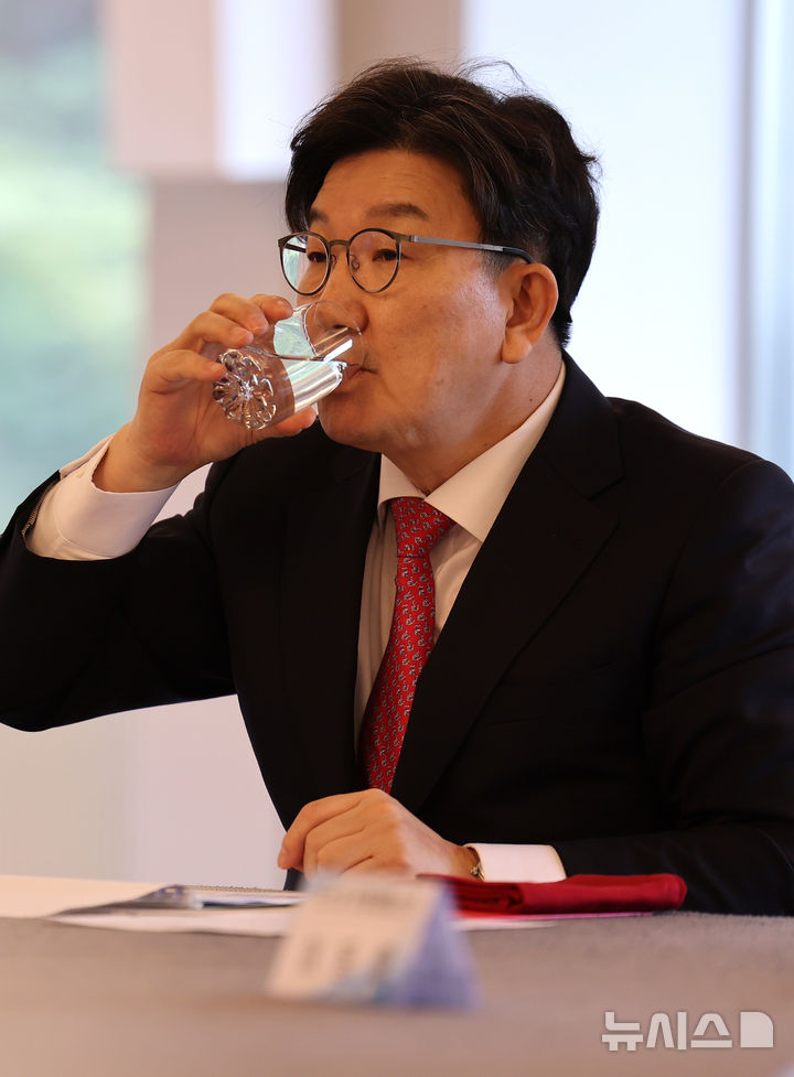 [포항=뉴시스] 이무열 기자 = 권성동 극민의힘 원내대표가 5일 경북 포항시 포스코 청송대에서 열린 철강 산업 위기 극복을 위한 현장 간담회에서 물을 마시고 있다. 2025.03.05. [email protected]