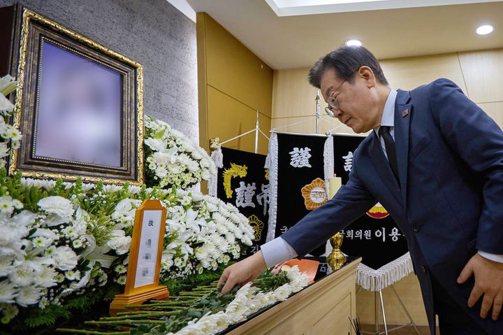 [서울=뉴시스] 조성우 기자 = 이재명 더불어민주당 대표가 5일 인천 서구 국제성모병원 장례식장에 마련된 인천의 한 빌라 화재로 숨진 초등학생 A양의 빈소를 찾아 조문하고 있다. (사진=더불어민주당 제공) 2025.03.05. [email protected] *재판매 및 DB 금지