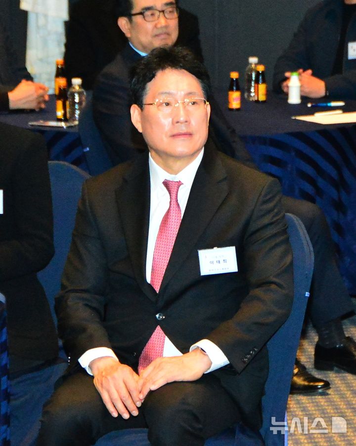 [청주=뉴시스] 서주영 기자 = 6일 충북 청주시 S컨벤션에서 열린 충북경영자총협회 회장 이·취임식에 이태희 신임 회장이 참석해 자리에 앉아 있다. 2025.03.06. [email protected]