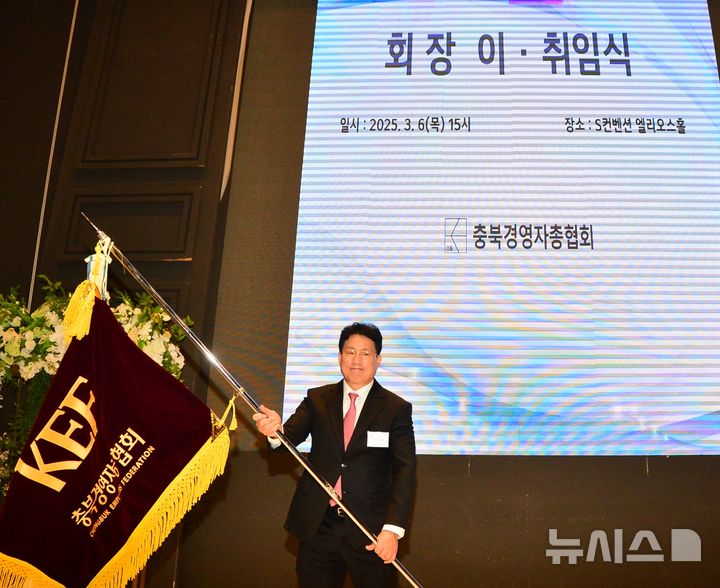 [청주=뉴시스] 서주영 기자 = 이태희 충북경영자총협회 신임 회장이 6일 충북 청주시 S컨벤션에서 열린 회장 이·취임식에서 협회기를 이양받고 있다. 2025.03.06. [email protected]