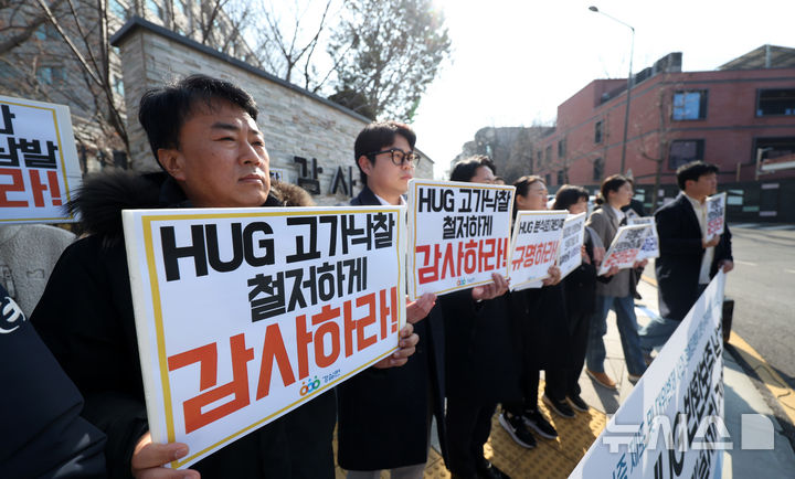 [서울=뉴시스] 김선웅 기자 = 경제정의실천시민연합 관계자들이 6일 서울 종로구 감사원 앞에서 HUG 보증금 반환보증 제도 및 대위변제 사건 경매집행에 대한 공익감사 청구 기자회견을 열고 감사원의 HUG에 대한 철저한 감사, 전세사기 악용되는 반환보증제도 즉각 개선, 경매주택 고가셀프낙찰 분식회계 악용 가능성 철저 규명, 정부의 혈세 낭비 주택 사들이기 사업 중단 및 공공우선매수권 적극 활용, 임대인 반환보증 의무가입 및 일부보증 실시 등을 촉구하고 있다. 2025.03.06. [email protected]