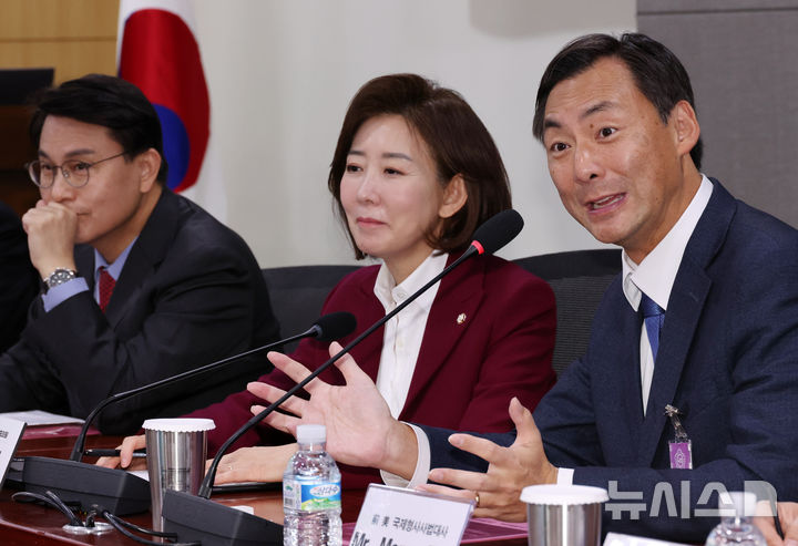 [서울=뉴시스] 조성우 기자 = 6일 오전 서울 여의도 국회 의원회관에서 열린 대한민국 자유민주주의·법치주의 위기와 한미 자유동맹의 길 : 모스 탄 전 미국 국제형사사법 대사 초청 세미나에서 모스 탄(오른쪽) 전 대사가 발언하고 있다. 왼쪽부터 윤상현, 나경원 국민의힘 의원, 모스 탄 전 대사. 2025.03.06. [email protected]